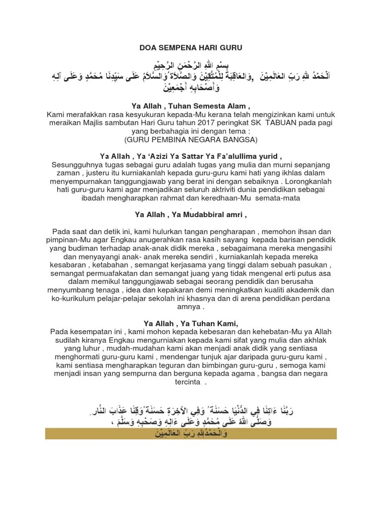 Doa dalam bahasa melayu sebenarnya lebih mudah . بسم الله الرحمن الرحيم الحمد لله رب العالمين , والصلاة والسلام على سيدنا محمد وعلى آله وأصحابه أجمعين. Teks doa majlis persaraan guru.docx. Doa sempena majlis pertukaran guru. Pada saat dan detik yang bersejarah ini kami menghulurkan . Doa perpisahan majlis ringkas untuk guru pegawai kakitangan. Pertemuan ini sebagai pertemuan yang dirahmati, dan jadikanlah perpisahan ini sebagai perpisahan yang diberkati. Doa doa majlis perpisahan by pertubuhan3kebajikan.